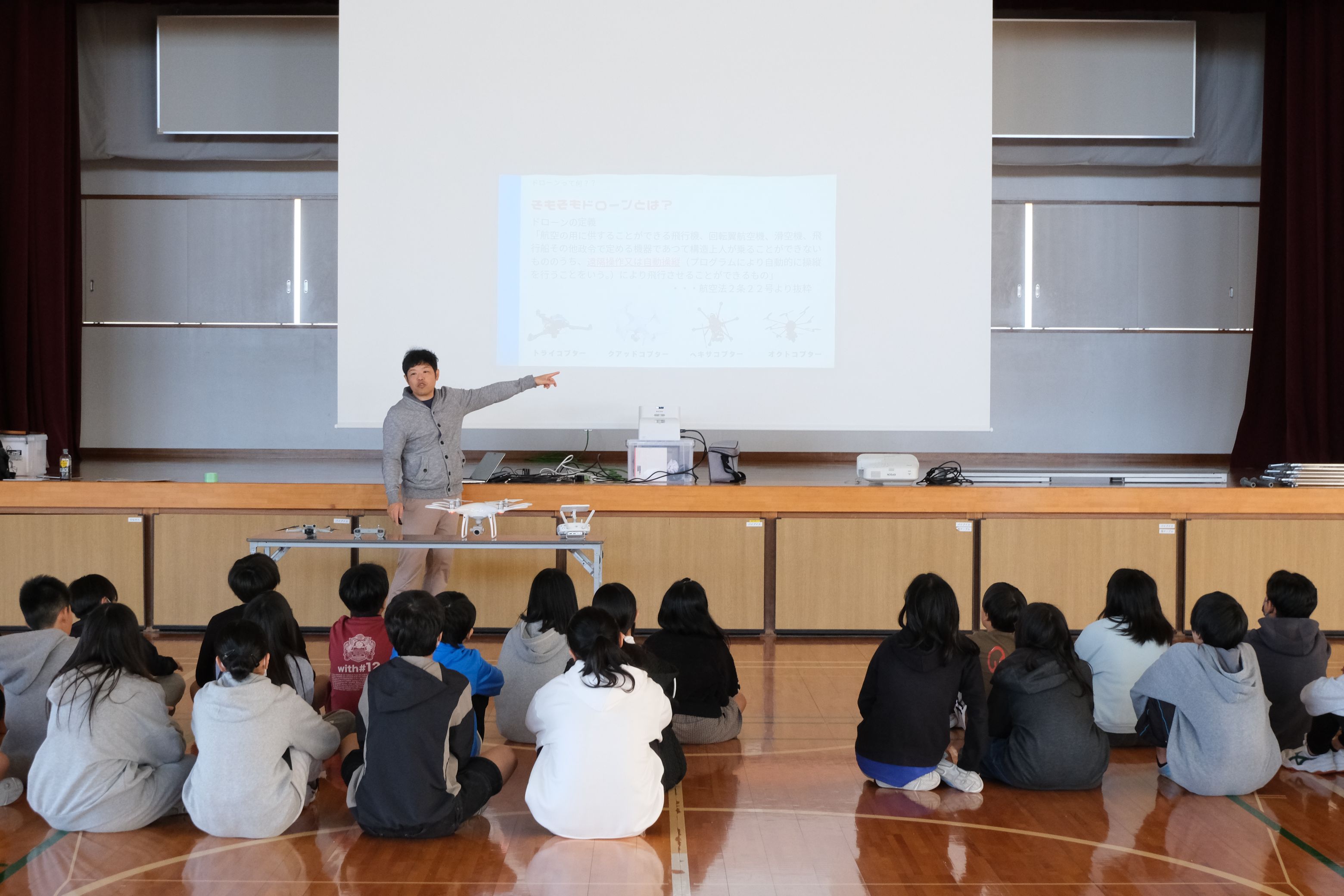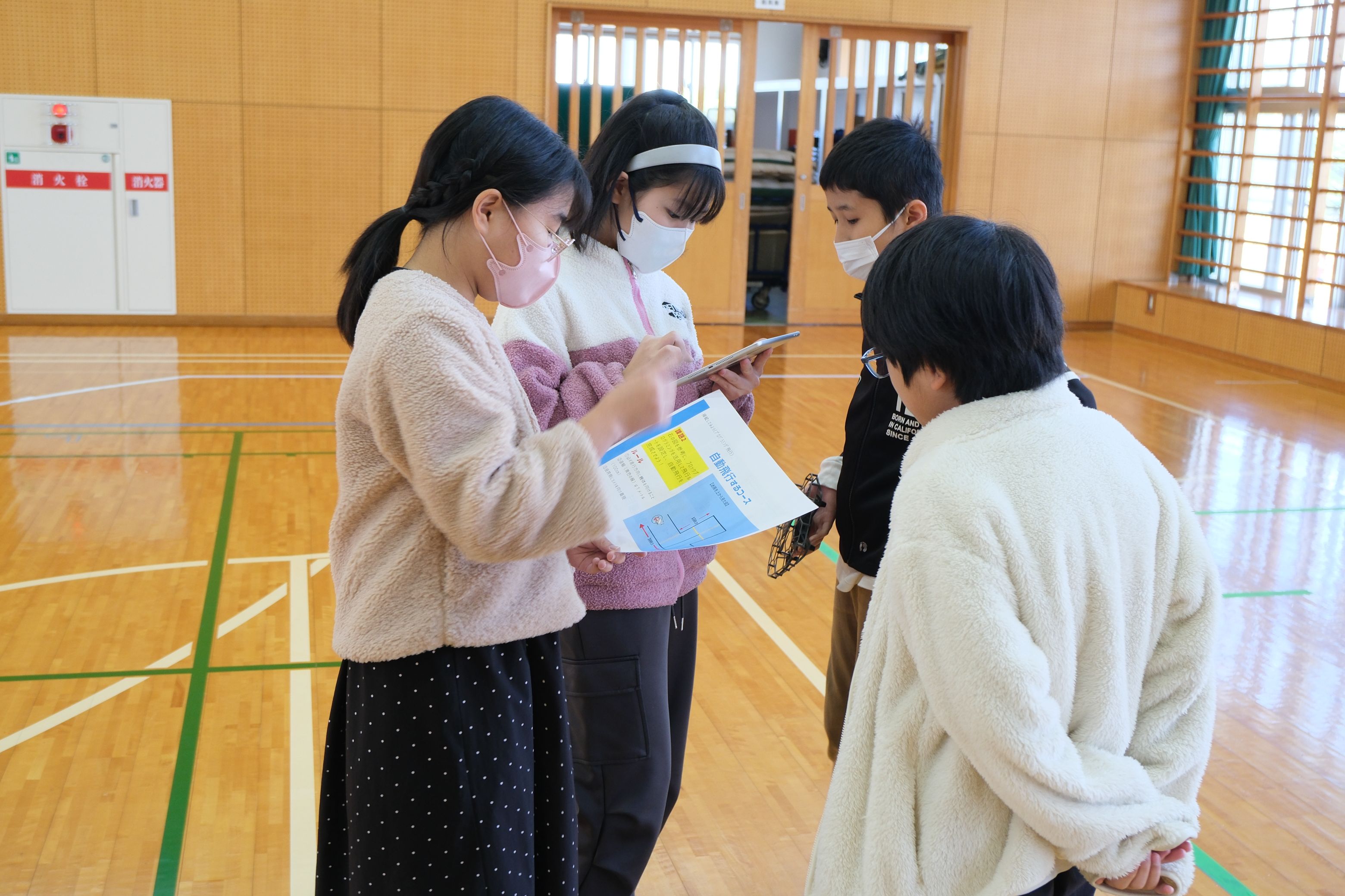 児童たちは、ドローンの基本的な操作方法を学びながら、プログラムによって機体を飛行させる体験に取り組みました。