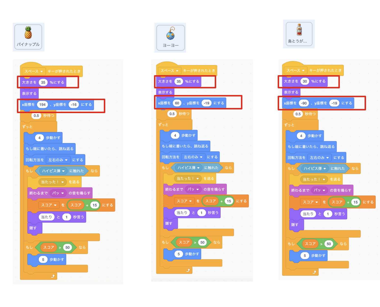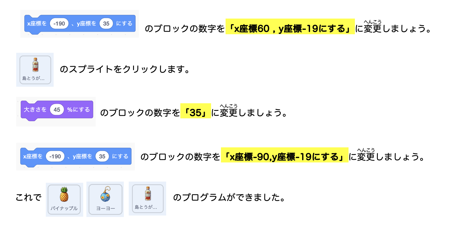 10.パイナップル・ヨーヨー・島とうがらしを動かす設定(せってい)