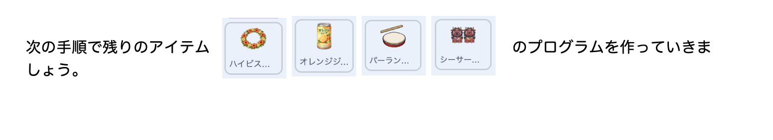 → 11 「ハイビスカスレイ」「オレンジジュース」「パーランクー」「シーサーの置物」を動かす設定