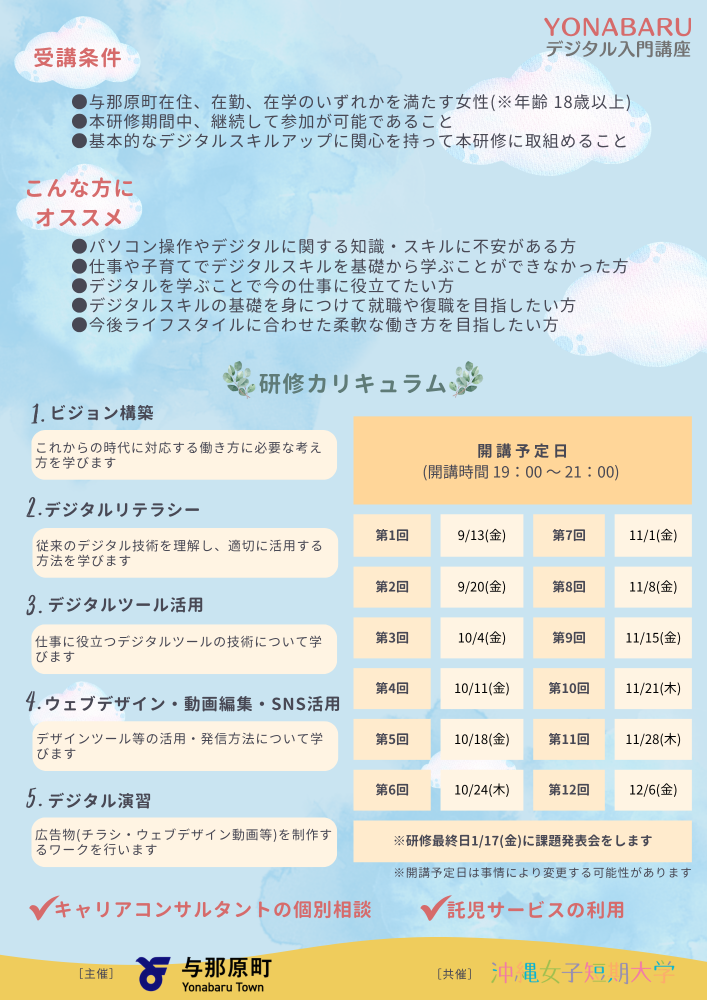 本学は、与那原町と連携し、地域の女性がデジタル技術を活用して新たなキャリアチャンスを掴み、地域社会に積極的に参画できるよう支援する人材育成事業を実施します。